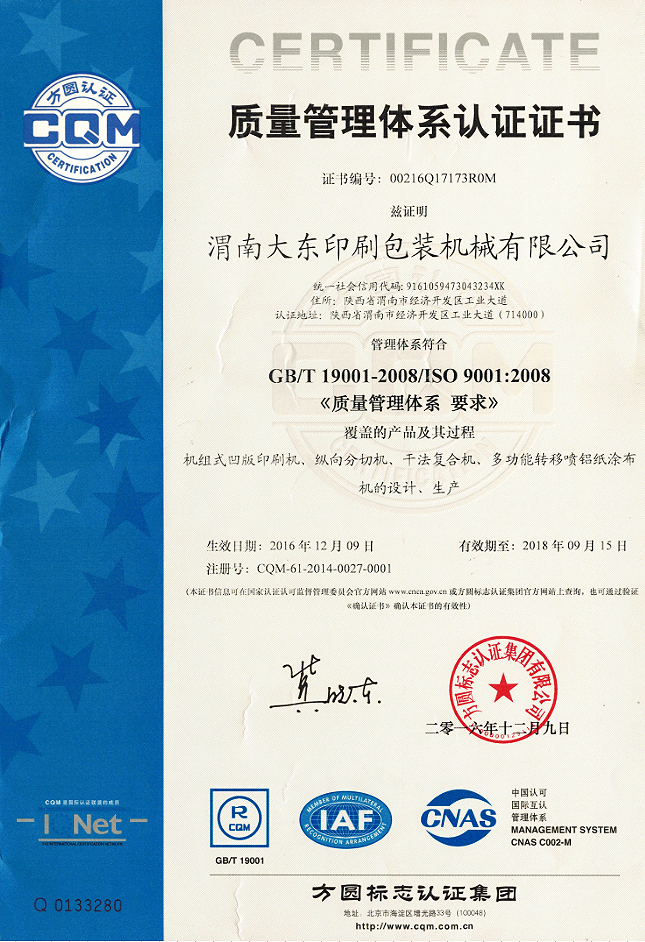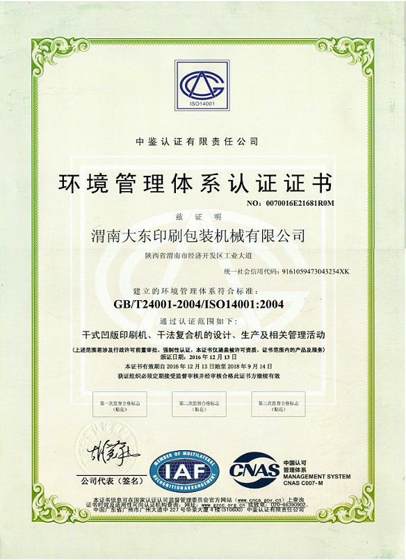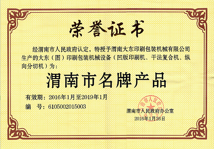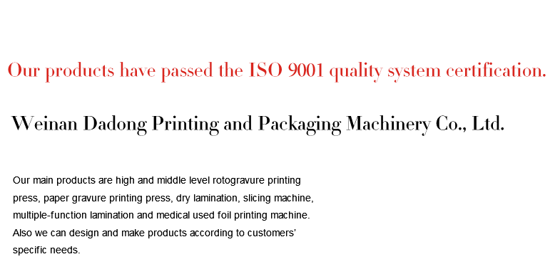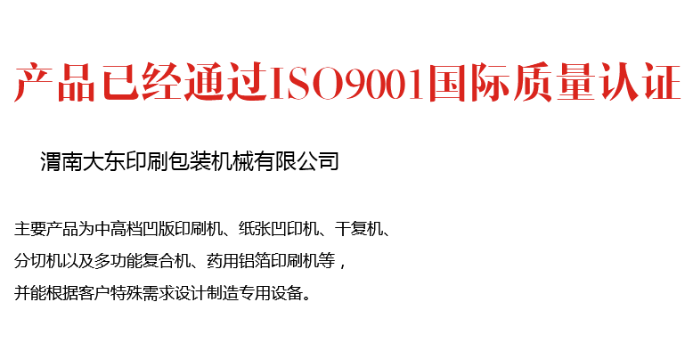 渭南大東印刷包裝機(jī)械有限公司成立于1991年,是一家專(zhuān)業(yè)研發(fā)及生產(chǎn)印刷包裝機(jī)械的裝備制造高新技術(shù)企業(yè)。企業(yè)通過(guò)了ISO9000質(zhì)量認(rèn)證體系、ISO14000環(huán)境體系和"高新技術(shù)企業(yè)"認(rèn)證。