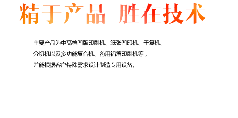 主要產(chǎn)品為中高檔凹版印刷機(jī)、紙張凹印機(jī)、干復(fù)機(jī)、分切機(jī)以及多功能復(fù)合機(jī)、藥用鋁箔印刷機(jī)等,并能根據(jù)客戶(hù)特殊需求設(shè)計(jì)制造專(zhuān)用設(shè)備